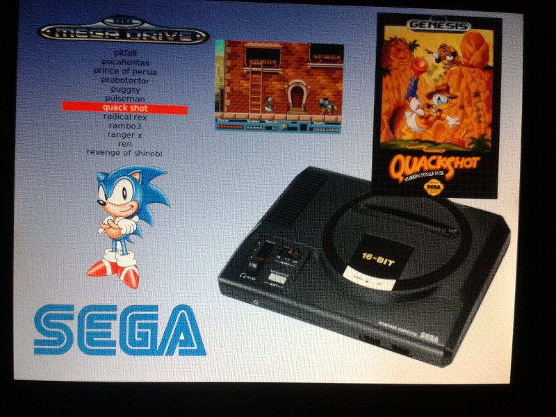 On peut voir sur l’image de droite les infos qui apparaissent sur l’écran, à gauche la liste de vos jeux Megadrive, au centre en haut une image tirée du jeu, à droite la jaquette ou la boîte du jeu. Tout ceci bien sûr est entièrement configurable. Il suffit ensuite d’un bouton pour passer au système suivant, ou pour lancer un jeu.