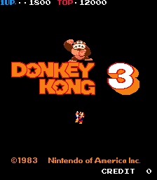 Alors aujourd’hui un test un peu spécial. Donkey Kong 3 sur Arcade. Reboutez vos cerveaux, oubliez 2014 et fermez les yeux. Nous sommes en 1983, vous vous baladez dans la rue et vous arrivez devant le bar où vous avez prévu de vous descendre quelques bières. Oui bon, je vois ce que vous êtes en train de vous dire: « en 1983 on avait 5 ans et on ne buvait pas de bière ». On s’en fout! On est des malades! Donc, vous arrivez devant ce bar et là, qu’est ce que vous voyez au fond de ce dernier, une magnifique borne d’Arcade orange avec écrit sur le côté, Donkey Kong 3. Vous vous jetez sur cet objet tant convoité et vous glissez à l’intérieur de la fente prévue à cet effet une petite pièce de 2 Francs. Oui alors une fois de plus je vois ce que vous pensez: « Mais de quoi il parle ce rigolo ? C’est quoi une pièce de 2 francs ? ». Je mettrai une photo ok, alors on ferme les yeux et on arrête de penser.