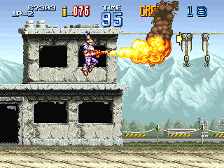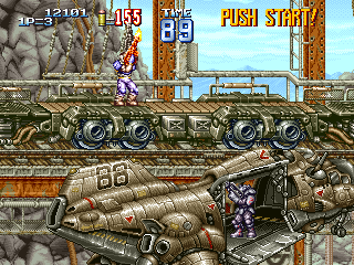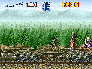 Gunforce 2 sur Arcade est un run and gun, vous savez ce genre de jeu où on avance et on détruit tout ce qui bouge. Pour ceux qui l’ignorent, sachez que Gunforce est réalisé par les créateurs de Metal Slug. La ressemblance se fait vite sentir, même si le personnage est plutôt d’un style réaliste sans les grosses têtes des Metal Slug. Le premier niveau se déroule sur un train et au bout de quelques secondes de jeu on délivre une jeune femme attachée à un poteau. Les amateurs de Metal Slug feront tout de suite le rapprochement avec les otages de la série. Puis viennent les premiers ennemis, les premiers cris, le premier boss et là on voit bien que les graphismes et les bruitages ressemblent beaucoup à Metal Slug. Le principe du jeu est toujours le même, on progresse avec ce super guerrier qui porte une mitraillette