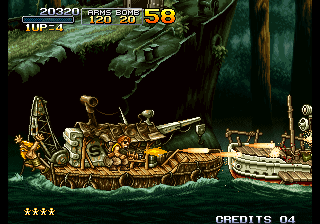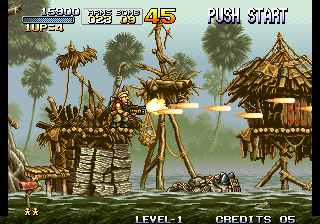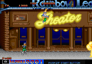 Toki est sorti en 1989 sur Arcade, il s’agit plus d’un plate-forme action que d’un Run and Gun, mais les deux genres sont très proches. Vous dirigerez Toki et devrez libérer sa petite amie. D’une réalisation plus qu’honorable pour l’époque, Toki est un jeu assez difficile que je mettrai dans la catégorie de Ghouls’n Ghosts. La jouabilité est très bonne, le personnage peut sauter, tirer, nager, monter à la corde et les niveaux sont variés. Un très bon jeu et surtout un classique du genre.