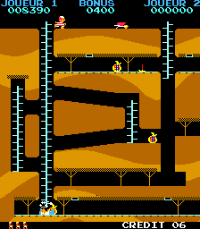 Bagman est un jeu de plate-forme réflexion sorti en 1982 sur borne d’Arcade. Vous dirigez un bagnard qui n’a qu’une seule envie, vider la mine de tout cet or. Le niveau est constitué de trois écrans sur lesquels apparaissent les différentes galeries, échelles et chariots qui constituent cette mine. Vous devez donc récupérer les sacs d’or et les mettre dans votre brouette. Seul petit souci, il y a deux gardes dans la mine qui veulent vous mettre au trou… (la mine, le trou… humour 🙂 ). Il faudra donc, s’emparer des sacs, mais aussi échapper aux gardes. Pour vous débarrasser des gardes, un seul moyen, une pioche disponible sur certains écrans, sinon vous pouvez lâcher un sac d’or du haut d’une échelle. Je ne vais pas vous dire d’acheter Bagman dans sa version d’origine, à moins que vous la trouviez à un prix abordable, mais par contre je vous