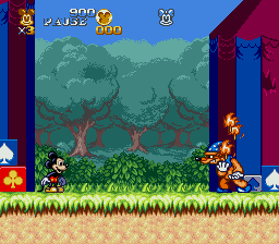 mickey circusThe Great Circus Mystery Starring Mickey and Minnie, voilà le titre du jeu, une horreur. Le jeu par contre n’est pas si horrible que son titre. On dirige Minnie ou Mickey voire les deux si on joue à deux. Minnie et Mickey devront retrouver leurs amis du cirque enlevés par Pat Hibulaire. Nous sommes devant un jeu de plate-forme qui à première vue semble destiné aux enfants, mais la jouabilité ne me paraît pas vraiment adaptée à nos chères têtes blondes. Le fait de pouvoir changer de tenue est intéressant, même si certaines tenues ne sont pas forcément pratiques. Ce Mickey est un petit jeu de plate-forme honorable, mais qui ne fait pas le poids face aux excellents jeux Disney que propose la Megadrive.A ESSAYER