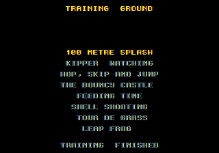 aquatic gamesThe Aquatic Games est un jeu multi-sport mettant en scène les personnages du jeu James Pond. Le principe est simple vous devez réaliser plusieurs épreuves et battre les différents records. Les épreuves sont complètement dingues, 110 mètres haies, mais avec des anguilles électriques, triple saut avec sauté de corde, trampoline sur des éponges géantes, bref c’est n’importe quoi. Aquatic Games est un jeu que je trouve très moyen, même si les épreuves sont originales. À essayer à plusieurs si toutefois vous trouvez des copains motivés, sinon à oublier.a oublier