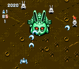 Gun Nac est un shoot’em up vertical sorti sur Nes en 1990. Le scénario est assez étrange, tous les animaux et les robots de la planète grossissent et se rebellent contre les humains, à priori à cause d’une vague d’énergie… enfin bref ni une ni deux vous sautez dans votre vaisseau spatial et allez combattre les lapins géants et autres robots étranges. Oubliez le scénario et laissez vous porter par un des meilleurs shoot’em up de la console. Les armes disponibles sont toutes très agréables et les bonus vous permettent d’augmenter leur puissance, de plus une super attaque est évidemment de la partie. Facile à manier et d’une réalisation d’un très bon niveau, Gun Nac est un jeu que doivent acheter les fanas de shoot’em up. Petit info de taille, le jeu n’est pas disponible en version européenne.