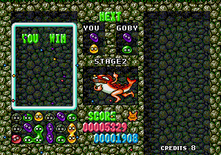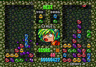 Puyo Puyo c’est le Tetris de Sega, sorti en 1992 sur Arcade ce jeu est une petite merveille qui sera adapté ensuite sur plusieurs supports. Comme souvent dans les puzzles games, le but est de pourrir la vie de son adversaire, il y a un mode story ou vous affrontez l’ordinateur et un mode deux joueurs ou vous affronterez toutes personnes voulant se mesurer à vous. Ici ce sont deux gouttes de couleurs qui tombent du haut de l’écran, vous pouvez les tourner ou encore les faire tomber plus vite. Ensuite c’est très simple il faut les ranger par couleurs, 4 gouttes de la même couleur disparaissent. Les lois de l’apesanteur étant respectées, il faut faire en sorte que les disparitions de gouttes s’enchaînent pour envoyer des gouttes transparentes qui gêneront l’adversaire. Puyo Puyo est une pure réussite et fait partie des me