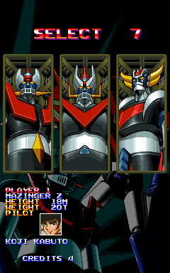 Bon alors Mazinger Z c’est tout simplement l’ancêtre de Goldorak, oui vous avez bien entendu Goldorak, le seul l’unique, le héro de mon enfance. Et bien vous savez quoi? Dans ce jeu on peut prendre le contrôle de Goldorak dans un shoot’em up… je suis tout fou. Nous sommes devant un shoot’em up vertical, trois robots disponible, Mazinger, Great Mazinger et… Goldorak!!! La réalisation est plutôt bonne et les personnages de la série bien reconnaissables. Plusieurs tirs, des power up, des attaques spéciales, bref du shoot’em up. Bruitages et musiques sortent directement de l’animée et je vous l’avoue c’est une tuerie. Mazinger Z est un bon shoot’em up pour ceux qui ne connaissent pas Goldorak et pour les autres comme moi, ce jeu n’a pas de prix…