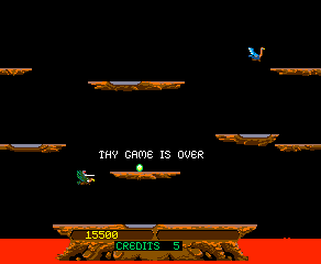Joust est un jeu de réflexion action sorti en 1982 sur Arcade qui vous met dans la peau d’un cavalier chevauchant une espèce d’autruche volante. Le but du jeu est de se débarrasser des ennemis présents dans les niveaux, enfin, le niveau puisque c’est toujours le même avec des plates-formes en moins. Pour faire tomber les ennemis vous devez les toucher, mais par le haut. À ce moment là, la monture adverse explose et le cavalier tombe et devient un œuf que vous devez récupérer. Joust est un peu compliqué à expliquer et il faut y jouer pour se faire une idée. Un jeu à essayer pour sa valeur historique et auquel vous vous surprendrez à rejouer.