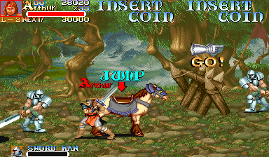Je suis un grand fan des beat’em all Arcade des années 90 comme vous pouvez le constater avec des jeux comme Cadillacs and Dinosaurs, Captain Commando, the Punisher ou encore ce petit Knights of the Round. Et bien tous ces jeux sont édités par Capcom, qui dans les années 90 domine largement le beat’em all. Ce knights of the Round vous permet de diriger le célèbre Roi Arthur, mais aussi Perceval et Lancelot. Vous l’aurez compris on est dans du médiéval, avec épées, chevaliers, catapulte, châteaux forts, chevaux… Graphiquement on se rapproche d’un Cadillacs and Dinosaurs, avec des couleurs pastels et des décors vivants et bien travaillés. Les sprites sont bien réalisés eux aussi et la jouabilité une fois de plus est simple et efficace. Les bonus sont toujours cachés dans les éléments du décors et cette fois vos personnages évolueront au fur et a