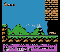 Felix le chat est un héros de dessin animé apparu pour la première fois en 1919. Cette adaptation Nes est plutôt réussie. Nous sommes devant un jeu de plate-forme aux graphismes colorés et mignons comme tout. La jouabilité est assez simpliste avec un bouton pour sauter et un pour frapper, mais le sac de notre héros regorge de surprises qui rajoutent un plus indéniable au gameplay. Les musiques et bruitages sont d’un bon niveau et la Nes s’en sort très bien. Le jeu n’est pas très long et plutôt enfantin, mais on prend plaisir à diriger ce chat pour qu’il retrouve sa fiancée. Ce Felix the Cat est un bon jeu basé sur une licence, ce qui est plutôt rare, donc n’hésitez pas à vous le procurer.