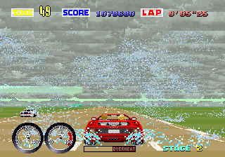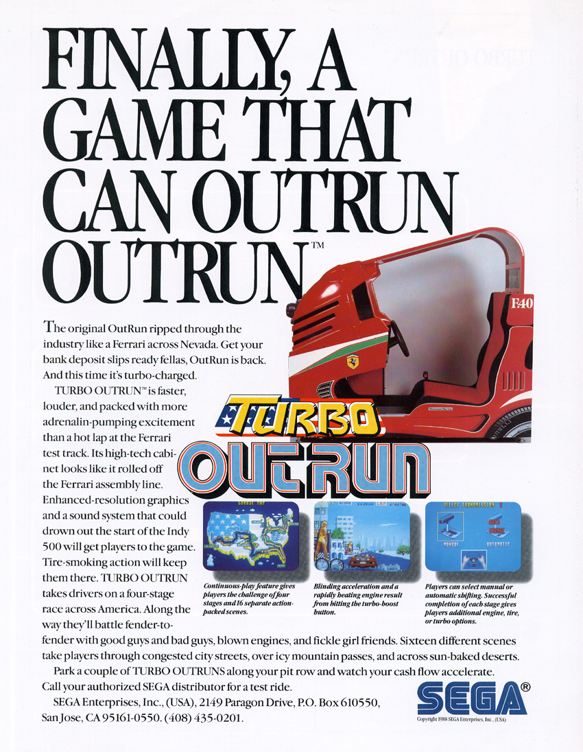 Turbo Out Run est la suite du célèbre jeu d’Arcade de Sega Out Run. Je le dis de suite, ce deuxième volet me plaît moins que le premier, déjà l’effet de surprise n’agit plus et surtout je trouve les graphismes bien trop pixelisés et fouillis pour prendre du plaisir. Il n’en reste pas moins que ce Turbo Out Run apporte quelques nouveautés, par exemple, vous avez maintenant un concurrent direct qui vous piquera votre copine si il finit devant vous, ou encore, le choix d’une boîte manuelle ou automatique, la présence d’un Turbo, un circuit plus long et plus variés. Turbo Out Run sans être un mauvais jeu, ne provoque pas le même engouement que le premier volet qui reste pour moi un meilleur choix, surtout pour les nostalgiques.