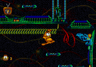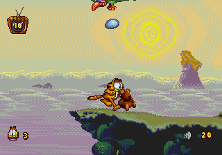 garfieldGarfield, le célèbre chat de bande dessinée arrive sur Megadrive dans un jeu de plate-forme. Notre ami Garfield se retrouve à l’intérieur de sa télé et devra parcourir des niveaux qui correspondent à des genres de films. Les graphismes sont très bons et la Megadrive est très bien exploitée, on reconnaît de suite le genre de film grâce aux décors et à l’ambiance. Garfield peut sauter, se baisser, regarder vers le haut, s’accrocher, bref il est agile le félin. Pour vous débarrasser des ennemis vous serez armé d’un objet différent suivant le genre de film, par exemple, une épée en bois pour le film de pirate. L’animation est très réussie autant celle de Garfield que celle des ennemis. Mais alors il est parfait ce jeu? Eh bien non, la jouabilité vient un peu gâcher la fête. Le personnage répond bien, mais parfois on tape à côté A ESSAYERdes ennemis et on a l’impression qu’il est impossible de ne pas se faire toucher, ou encore dans certains passages on se demande quoi faire. Grafield est un bon jeu de plate-forme malgré tout et il ravira les fans du matou, à essayer donc.