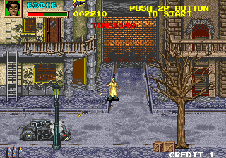 Dead Connection de Taito est le genre de jeu qui me fait aimer l’Arcade. Nous sommes devant un jeu d’action au scénario classique, vous dirigez quatre détectives qui doivent combattre une grande famille du crime et délivrer une jeune femme. Le jeu propose une vue plongeante dans laquelle la totalité du niveau apparaît. Votre personnage peut se déplacer dans toutes les directions et les ennemis arrivent de tous les côtés. Un bouton pour tirer et un pour effectuer une roulade ou vous allonger. Graphiquement le jeu est réussi avec des décors fouillis et détaillés. L’animation est réussie, malgré des sprites de petites tailles et l’action ne s’arrête jamais, ça tire de tous les côtés, ça explose, les ennemis et les voitures flambent et les décors sont souvent destructibles. L’ambiance du jeu, style film