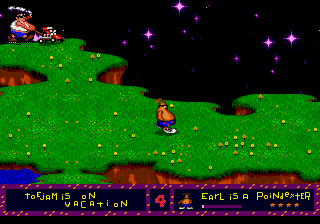 ToeJam and Earl est un des jeux les plus originaux de Sega. Vous dirigez ToeJam et Earl, deux extraterrestres au look étrange et à la dégaine très hip-hop. Ces deux guignols se sont écrasés sur une planète étrange à bord de leur vaisseau. Le but est d’explorer les niveaux afin de retrouver les pièces du vaisseau. Dans chaque niveau il y a un ascenseur qui vous permettra de monter au niveau suivant, mais il n’y aura pas forcément une pièce de l’engin. Les graphismes sont assez vides, mais très colorés et les sprites des héros ou des ennemis sont très drôles. L’animation est réussie et l’humour très présent. Des paquets cadeaux se trouveront dans les niveaux et ils renfermeront des bonus assez originaux, le problème c’est que vous devrez les ouvrir pour voir ce qu’ils contiennent. To
