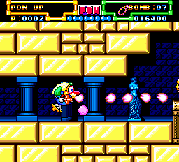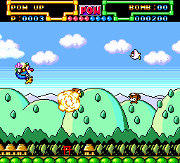 Derrière ce non à rallonge se cache un shoot’em up style Parodius ou Coryoon, mais en moins bien. Vous dirigez une espèce d’oiseau étrange qui peut grossir suivant les bonus que vous récoltez. D’autres bonus augmenteront votre puissance de feu ou encore feront apparaître deux satellites. Bref, c’est du classique et le seul point original c’est l’humour ambiant. Les graphismes sont potables et la maniabilité quelque peu délicate. Je ne vais pas m’attarder sur ce jeu, la PC Engine est une console très bien fournie en shoot’em up et ce Hana TaKa Daka est loin des meilleurs.