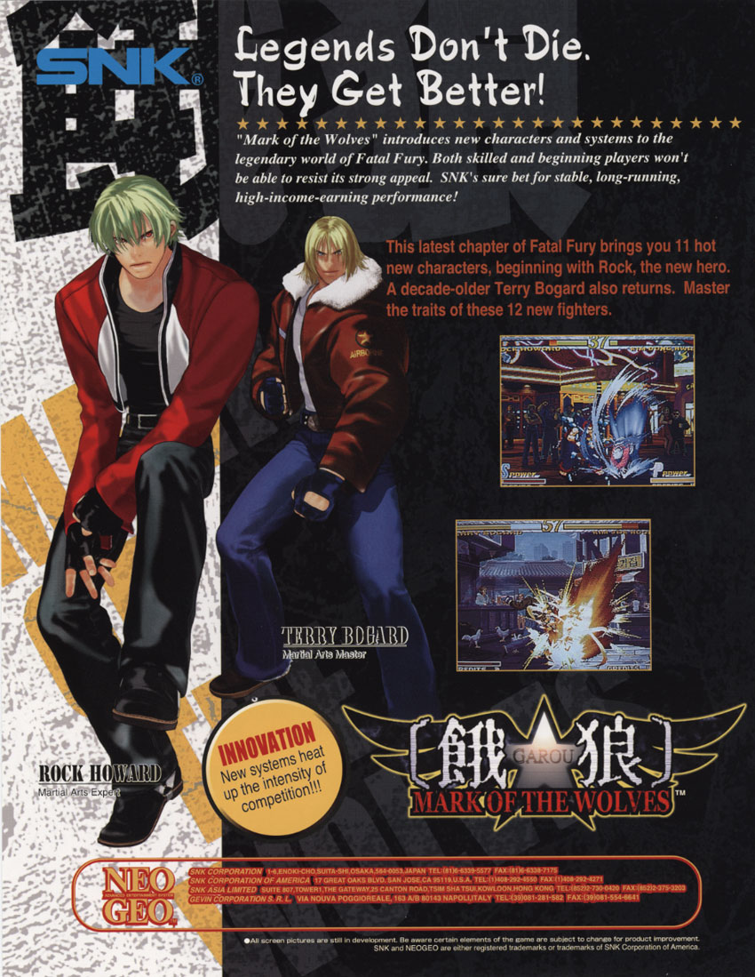 Garou: Mark of the Wolves est le dernier Fatal Fury de la Neo Geo et c’est une réussite, un des meilleurs volets de la série, même si au risque de m’attirer les foudres de certains je lui préfère un Real Bout Fatal Fury Special. Par contre graphiquement ce Garou est sans doute le plus réussi de la série, les décors sont magnifiques, proches d’un Last Blade. Les personnages sont très bien dessinés et l’animation est superbe. La jouabilité est elle aussi excellente, mais un peu plus exigeante qu’un Real bout. Par contre, fini les combats sur deux plans, dans ce volet on reprend sur du classique. Je ne peux que vous conseiller, une fois de plus, d’aller sur le site NeoGeo Spirit pour en savoir un peu plus et bien sûr d’essayer ce Garou Mark of the Wolves, puis finalement de l’acheter ;-).