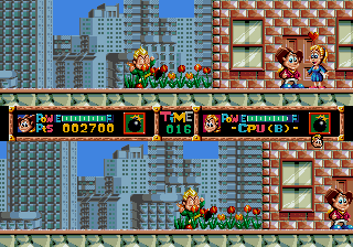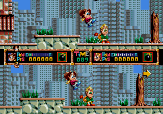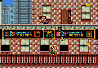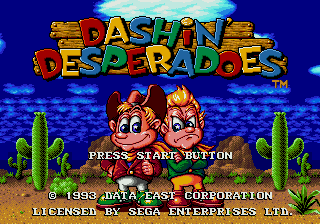 Dashin’ Desperadoes est un jeu assez particulier, il vous propose une espèce de course à pied en écran partagé. Le but étant de rejoindre une jeune femme se trouvant à la fin du niveau avant l’adversaire. Personnellement je ne trouve que très peu d’intérêt à ce jeu, surtout en solo. On court comme des idiots, on saute, on tombe dans des pièges, on s’envoie des bombes et au final… il ne reste pas grand chose. Sinon c’est pas trop moche et à peu près jouable, mais bon je pense qu’il y a beaucoup d’autres jeux à acheter sur Megadrive.