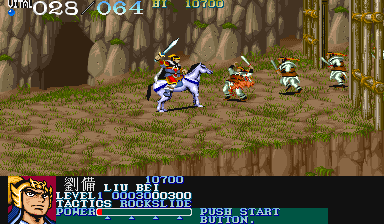 Je le répète une fois de plus, j’adore les beat’em all Arcade, donc naturellement j’ai joué à Dynasty Wars. Je préfère le préciser de suite, pour moi, ce Dynasty Wars ressemble plus à un shoot’em up qu’à un beat’em all. En fait on parcourt les niveaux à dos de cheval et on peut seulement taper devant soi avec son armes. Les graphismes sont corrects pour l’époque et l’animation est un peu rigide. La jouabilité est simpliste et le jeu peut vite devenir lassant. Dynasty Wars est un bon jeu de 1989, mais je vous conseille plutôt de vous dirigez vers sa suite, Warriors of Fate, qui en plus d’être bien plus beau, propose plus de coups et de variété.