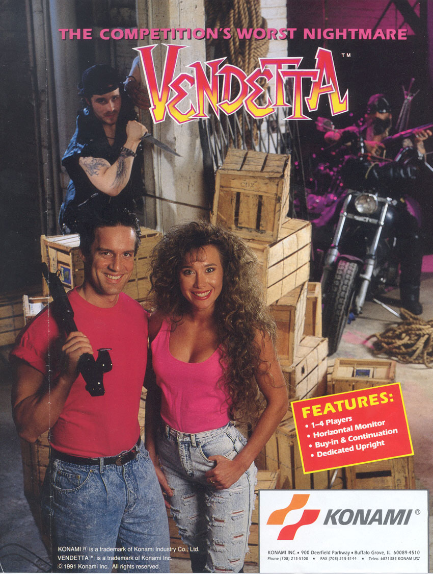 Vendetta ou Crime Fighter 2 en japonais est un beat’em all de l’éditeur Konami. Vous devez débarrasser la ville des gangs mais aussi sauver une jeune femme. Quatre personnages sont disponibles et le jeu à quatre est bien sûr possible. La jouabilité est classique pour l’époque avec un bouton pour sauter et un pour taper, un appui sur les deux boutons déclenche une super attaque. Graphiquement on est devant un jeu aux décors variés et détaillés. L’animation est assez rigide, mais l’humour et la variété des coups sauvent le tout. En fait, ce qui fait la force de Vendetta c’est son ambiance et le fait de pouvoir taper les ennemis au sol ou encore pouvoir ce débattre quand on est ceinturé par un vilain. Vendetta est un bon petit beat’em all, qui pèche un peu à cause d’une