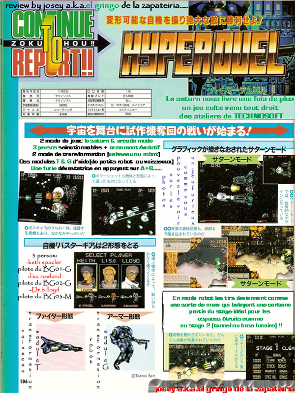 Encore un shoot’em up sur Arcade et encore un bon jeu. Cette fois c’est Technosoft qui s’y colle, ce qui explique la ressemblance avec le jeu Thunder Force 3 sur Megadrive. Trois vaisseaux disponibles avec, pour chacun, la possibilité de se transformer en robot. Chaque vaisseau dispose de ses propres tirs, mais le principe de transformation est le même. En position vaisseau, vous êtes plus mobile et en position robot, votre puissance de feu est plus forte. Les graphismes sont très bons pour l’époque et on reconnaît de suite la patte de Technosoft. Les musiques et bruitages sont aussi d’un bon niveau. Une action parfois confuse et la difficulté de certains passages viennent ternir un peu le résultat, mais rassurez-vous Hyper Duel reste un bon shoot Arcade.