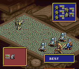 sont représentées par un personnage. Graphiquement cette phase est plutôt moche, mais heureusement les phases de combats sont mieux réalisés, même si on est loin des hits de la Super Nintendo. Par contre les thèmes musicaux sont superbes. Vous pourrez bien évidement faire évoluer vos troupes et en recruter de nouvelles. Ogre Battle est un jeu très riche au niveau du gameplay et du scénario. Toutefois, je le conseille seulement aux amateurs du genre, pour les autres un bon vieux Front Mission, plus orienté action fera l’affaire.