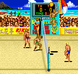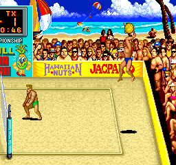 U.S.Championship V’Ball est un jeu de beach volley qui peut se jouer à 4 joueurs. Les match se déroulent en deux contre deux évidement et c’est le premier qui arrive à dix qui gagne la partie. Les graphismes sont assez simples et les décors manquent de variété, mais le principal attrait du jeu n’est pas là. Ici, le point fort c’est le fun et croyez moi il arrive très vite surtout à plusieurs. Un bouton pour sauter et un pour frapper la balle, c’est simple c’est jouable et même si ce n’est pas exempt de tout reproche c’est efficace. Il faut rajouter la possibilité de réaliser des coups puissants qui mettront l’adversaire au sol. V’Ball n’est sans doute pas le meilleur jeu vidéo du monde, mais son accessibilité et son fun en font un super jeu de sport et un des meilleurs jeux de beach volley que je connaisse, moi j’adore.