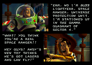 Toy Story… un des plus grands chefs d’œuvre de Disney. J’adore le dessin animé, c’est même un de mes préférés, mais par contre je ne comprends pas l’engouement pour le jeu sur Megadrive. Ce n’est pas un mauvais jeu, la jouabilité est plutôt agréable, l’animation est très bien rendue et fidèle à l’animé et les musiques restent de bonne qualité pour la console de Sega. Mais je ne sais pas pourquoi, je n’arrive pas à me faire aux graphismes, ça me fait penser aux graphismes d’un Donkey Kong Country, des graphismes pas adaptés aux consoles de l’époque. Il y a aussi le fait que je n’accroche pas au déroulement des niveaux qui même s’ils respectent le scénario du film me paraissent un peu lourds dans leurs exécutions. Un bon jeu donc, mais il me manque l’étincelle des autres jeux Disney de l’époque comme Aladdin, Quackshot ou Castle of Illusion.