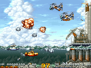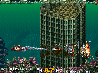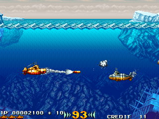 La première chose que l’on remarque dans In the Hunt, mis à part le fait que l’on dirige un sous-marin, ce sont les graphismes ressemblant beaucoup à ceux de la célèbre série des Metal Slug. Ce qui peu paraître logique quand on sait que Nazca, la société ayant créé Metal Slug est composée d’anciens employés de chez Irem responsable de In the Hunt. Au niveau des shoot’em up comme de beaucoup de chose je suis resté classique et In the Hunt c’est du shoot classique. Défilement horizontal, bruitages et musiques explosifs, animation et sprites bien réalisés, bref pour moi In the Hunt c’est du bon, du classique certes, mais du bon. En plus il faut rajouter à tout cela une jouabilité quelque peu original du fait que l’on dirige un sous-marin. On peut lancer des missiles devant avec un bouton,