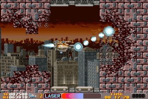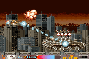 Gallop Armed Police Unit est un shoot’em up à scrolling horizontal créé par la société Irem. Irem pour ceux qui l’ignorent, ce sont les créateurs de la Saga R-Type, une légende du shoot Arcade. Le jeu vous met au commande d’un seul vaisseau, mais ce dernier est suffisamment performant pour vous permettre de nettoyer les niveaux. Le vaisseau est très jouable et vous avez la possibilité d’accélérer ou de ralentir, simplement, en dirigeant la manette vers l’avant ou l’arrière. Deux boutons pour le tir, un pour un tir basique qui augmentera de puissance suivant les bonus et un pour un tir spécial. Ce tir spécial, se présente sous la forme d’un laser qui se dirige automatiquement vers les ennemis à l’écran et qui fera feu temps que vous laisserez le bouton enfoncé. Malheureusement ce tir n’est pas illimité et il faudra attendre que la jauge se remplisse avant de