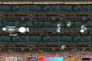 pouvoir l’utiliser à nouveau. Graphiquement la pâte de Irem est tout de suite visible avec des graphismes pixelisés et détaillés style In The Hunt ou Metal Slug . Les musiques ne sont pas transcendantes, mais les voix digitalisées sont elles très réussies et donnent une belle ambiance au jeu. Un bon shoot’em up donc, assez difficile, mais comme je le dis souvent : Sur Arcade, temps qu’il y a des pièces de monnaie il y a de la vie…