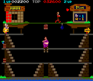 Popeye, le célèbre marin a eu droit lui aussi à une adaptation sur borne Arcade. Le jeu ressemble à un Donkey Kong, ce qui est normal quand on sait que le jeu est édité par Nintendo. Vous dirigez Popeye et vous devez récupérer les cœurs que vous envoie Olive, la copine de Popeye. vous pouvez juste courir et donner des coups de poing et croyez moi cela ne suffira pas à vous débarrasser de Brutus, le rival de notre marin. Heureusement, une fois la boîte d’épinard en votre possession, vous pourrez exploser le vilain. Graphiquement simpliste, dans un style Donkey Kong assumé, ce jeu vous prendra bien la tête avec une musique et une jouabilité assez énervante comme souvent avec les jeux de réflexion de l’époque. Un jeu à réserver aux puristes et aux amateurs de challenge.
