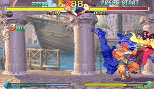 Aujourd’hui, je vais vous parler de Street Fighter Alpha 2. La série des Alpha est assez réussie et propose des graphismes d’une grande qualité avec des personnages au style dessins animés plus prononcé que dans les autres Street Fighter. Le jeu se déroulant un peu avant Street Fighter 2 nous retrouvons certains personnages de la série, mais aussi des nouveaux issus d’autres jeux Capcom. Au niveau de l’animation, c’est du grand Capcom et ce deuxième volet des Alpha est encore plus réussi. La jouabilité me semble meilleure que dans le jeu précédent et les combos et coups spéciaux sortent facilement. Je ne peux malheureusement pas vous détailler toutes les possibilité du gameplay, faute de place, mais vous trouverez cela sur internet sans problème. Un bon Street Fighter qui donne un petit coup de jeune à la série.