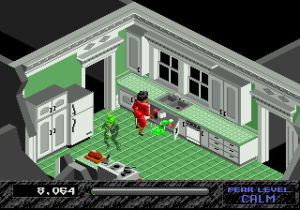 Hauting sur Megadrive est un jeu original. Tellement original que je ne suis pas en mesure de vous dire à quel type de jeu il appartient. Vous dirigez un jeune fantôme qui veut se venger d’une riche famille en les effrayant. Pour cela vous disposez d’une barre d’énergie « fantomesque », oui! j’invente des mots, qui vous permet de prendre possession des objets se trouvant dans la maison. Chaque objet pouvant être possédés est défini par une couleur. Il vous suffit de passer à côté d’un objet et d’appuyer sur le bouton pour prendre possession de l’objet et ensuite de voir le résultat sur vos victimes. Les graphismes sont un peu trop pixelisés à mon goût, mais suffisamment détaillés pour bien comprendre l’action et profiter des nombreuses transformations d’objets. Car c’est bien là le côté amusant du soft, voir un tapis se