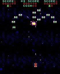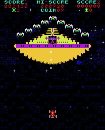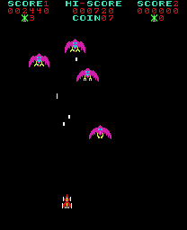 En 1980, un an après la sortie de Galaxian, un nouveau shoot’em up fait son apparition sur Arcade. Ce jeu c’est Phoenix et il est assez révolutionnaire pour l’époque. D’abord il propose cinq niveaux, ensuite votre vaisseau dispose d’un bouclier protecteur et pour finir, le premier boss de l’histoire des shoot’em up fait son apparition. Graphiquement vous vous doutez bien que l’on est loin des shoot’em up qui sortiront sur Megadrive ou PC Engine, mais nous sommes en 1980 et pour l’époque c’est pas mal. Les ennemis, des espèces d’oiseaux étranges, sont tous gentiment alignés et chacun leur tour ils vont ce jeter sur vous tels des piafs dépressifs. L’animation et les bruitages ressemblent beaucoup à un Galaga ou un Galaxian. La maniabilité est digne de l’époque avec un manque de réactivité flagrant qui fait tout le charme de ces bon vieux jeux d’Arcade. Un shoot à essayer, pour son côté historique et aussi pour voir l’évolution des shoot’em up.
