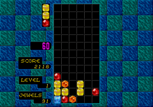 Nintendo a son Tetris et Sega à son Columns. Dans Columns se sont des colonnes de trois diamants qui descendent du plafond. Des diamants de différentes couleurs évidement et dont vous pouvez changer l’ordre. Le but est comme souvent dans ce type de jeu, d’aligner trois diamants de la même couleur. Une fois les trois diamants ou plus alignés, la ligne disparaît. Horizontal, vertical ou diagonale tout est bon pour faire baisser le nombre de diamants à l’écran. La jouabilité est d’une simplicité à toute épreuve, un bouton pour changer l’ordre des diamants et la croix de direction pour diriger la colonne. En appuyant vers le bas on accélère la chute de la colonne. Plus vous détruisez de colonne et plus ça va vite. Le but étant de faire un maximum de point. Le mode deux joueurs est assez triste étant donné que contrairement à un Puyo Puyo,