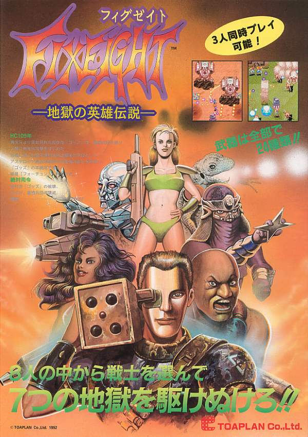 Fixeight est un run and gun vertical style Shock Troopers ou encore Ninja Comando, deux jeux sur Neo Geo. Vous avez la possibilité d’incarner 8 personnages au choix. Chaque personnage a un armement et une puissance de feu différente. Pour autant on ne sent pas de réels changements de gameplay entre les protagonistes. Par contre, au cours des niveaux vous pourrez passer sur une plate-forme de couleur qui vous permettra de changer de type de tir, soit multidirectionnel soit fixe ( droit devant ). Ce sera à vous, suivant la configuration du terrain, de choisir le bon type de tir. Avec des graphismes assez inégaux et des musiques et bruitages discrets, ce Fixeight est bien moins impressionnant qu’un Shock Troopers. Un jeu à essayer sur émulateur, histoire de se défouler.