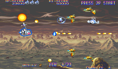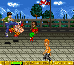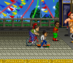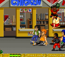 Dead Connection de Taito est le genre de jeu qui me fait aimer l’Arcade. Nous sommes devant un jeu d’action au scénario classique, vous dirigez quatre détectives qui doivent combattre une grande famille du crime et délivrer une jeune femme. Le jeu propose une vue plongeante dans laquelle la totalité du niveau apparaît. Votre personnage peut se déplacer dans toutes les directions et les ennemis arrivent de tous les côtés. Un bouton pour tirer et un pour effectuer une roulade ou vous allonger. Graphiquement le jeu est réussi avec des décors fouillis et détaillés. L’animation est réussie, malgré des sprites de petites tailles et l’action ne s’arrête jamais, ça tire de tous les côtés, ça explose, les ennemis et les voitures flambent et les décors sont souvent destructibles. L’ambiance du jeu, style film