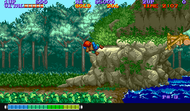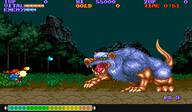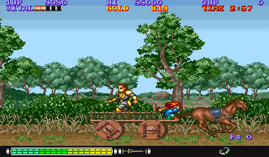 Dynamite Duke c’est le jeu d’Arcade à l’état pur, on met des crédits et on défouraille comme des dingues. Votre personnage est vu de dos et vous devez abattre les ennemis qui se baladent dans le décor. Les décors justement, sont assez sympathiques, même si certaines proportions au niveau des véhicules ou des ennemis vont vous paraître bizarre. Le jeu est assez simple à comprendre, on se déplace suivant un scrolling horizontal la plupart du temps et on tire sur tout ce qui bouge. Un bouton pour le tir, mais aussi deux boutons pour les coups au corps à corps. En effet, certains ennemis viendront vous chercher au premier plan. Vous pouvez aussi réaliser une espèce d’esquive qui vous permettra de vous dégager de certaines situations. Alors oui, Dynamite Duke c’est bourrin, oui ce n’est pas très varié, mais on