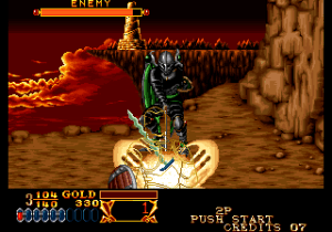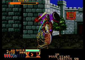 Crossed Sword c’est un peu The Super Spy, mais dans une univers héroïc-fantasy. Le jeu commence par une introduction bien réalisée qui nous présente rapidement l’histoire. Les graphismes sont assez bons et donnent une ambiance un peu sombre au titre. Les ennemis sont peu variés, mais bien dessinés et d’une bonne taille. Votre personnage et transparent et seuls ses contours apparaissent à l’écran. La jouabilité est simpliste, parfois un peu lourde et surtout très répétitive. Le côté aventure est vite oublié et même si notre personnage évolue ou qu’il est possible d’acheter de nouveaux équipements, on est très loin des RPG disponibles sur Megadrive ou Super Nintendo. Un jeu à essayer et qui propose un mode deux joueurs.