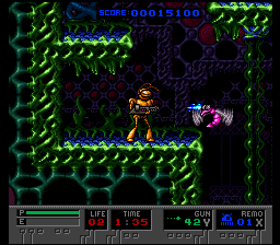 B.O.B est un jeu que j’aime beaucoup, autant dans sa version Megadrive que Super Nintendo, avec tout de même une préférence pour la version Super Nintendo. Vous dirigez Bob, un petit robot qui se retrouve sur une planète inconnue après un accident de vaisseau spatial. Les points forts du jeu sont les mouvements de Bob et ses nombreux gadgets, en effet vous