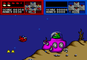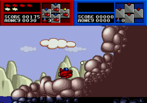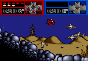 Comme je vous l’avais déjà dit auparavant, j’essaie de trier les jeux auxquels je joue. Eh bien, Gadget Twins est passé à travers les mailles du filet et j’ai pêché cet espèce d’avion étrange. Nous sommes devant un shoot’em up, genre très bien représenté sur Megadrive avec un florilège de hits comme Thunder Force, Gaiares, M.U.S.H.A. Vous dirigez un petit avion qui à la possibilité de tirer ou du moins frapper dans les quatre directions. Original! vous allez me dire, sauf que tout ceci est très mal pensé. Il faut appuyer sur une touche pour pouvoir sélectionner une direction, puis ensuite appuyer sur le tir pour pouvoir frapper, bref c’est de la pipe, c’est injouable. Il faut rajouter à cette jouabilité pourrie, un scrolling qui ne cesse d’avancer dans toutes les directions et des ennemis arrivant de partout. Un point positif peut-être? Euh, oui c’est… « mignon ».