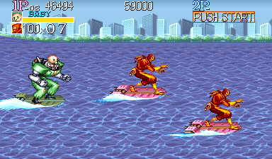 Après un premier jeu Tortues Ninja assez réussi, l’éditeur Konami nous revient avec un deuxième volet appelé Turtles in Time. Comme le nom l’indique les tortues vont voyager dans le temps et traverser plusieurs époques. Les graphismes ont été améliorés, les décors sont plus nets et les personnages plus fins et colorés, bref tout ça est bien plus lisse et agréable à regarder. La jouabilité par contre n’a pas beaucoup évoluée, même si les tortues disposent de plus de mouvements. L’animation est plus fluide et les musiques et bruitages de meilleure qualité, il suffit de voir le générique de début du jeu, carrément chanté. Bref un bon petit jeu que vous devrez vous procurer si vous aimez les beat’em all et les parties à quatre joueurs.